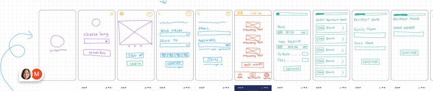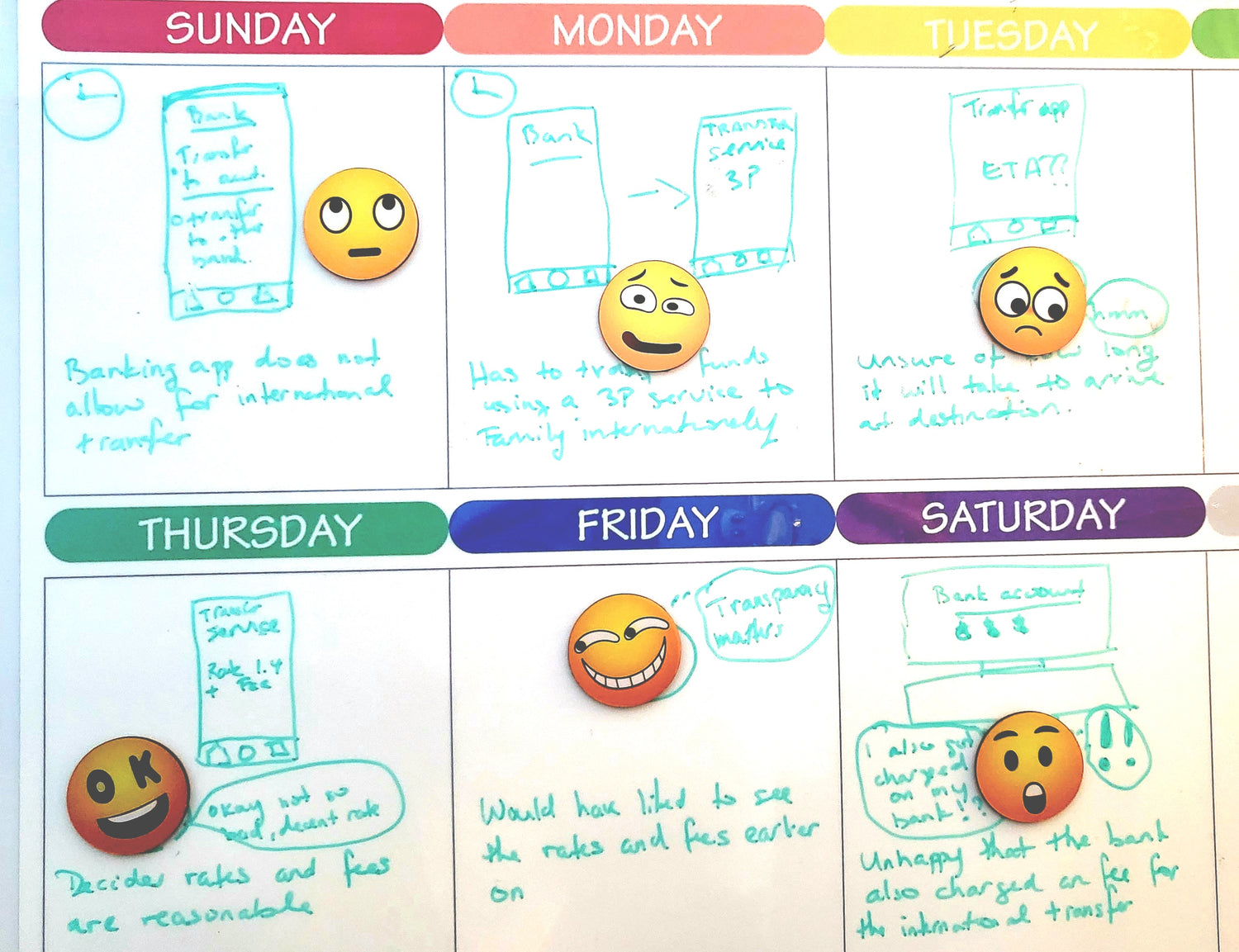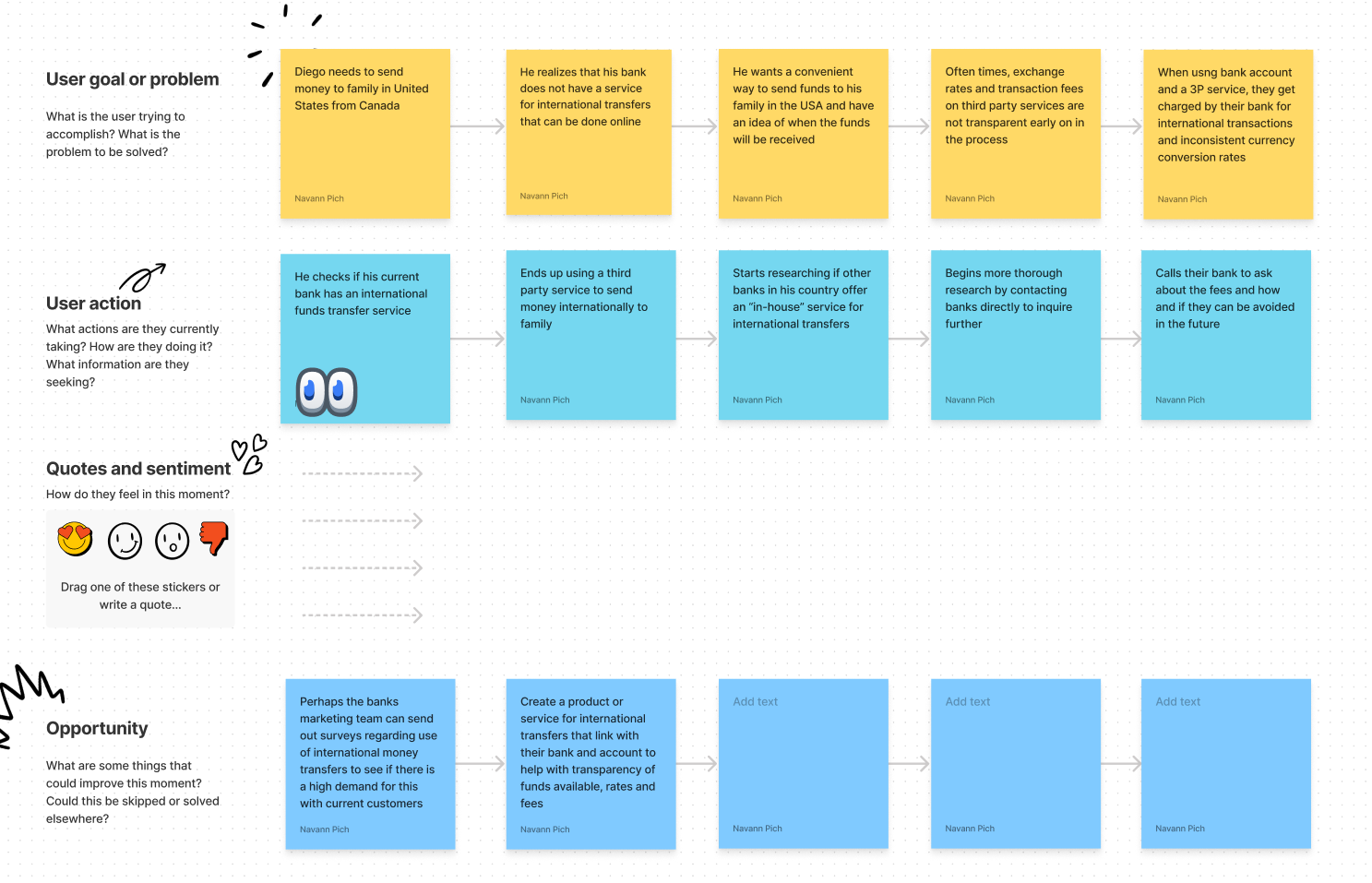 While working on our journey map, I also put together a storyboard to illustrate the user's current experience when they want to transfer foreign currency internationally
